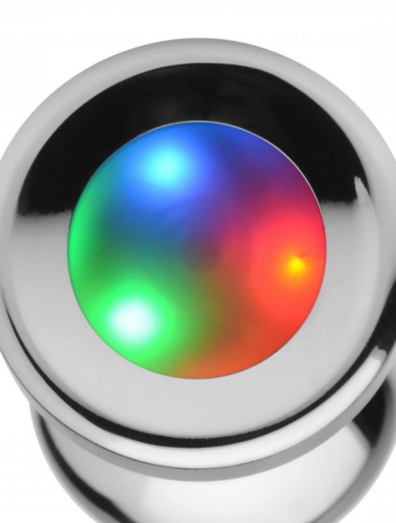 Metalen buttplug in hoogwaardig aluminium met een 3 kleuren led licht met 3 patronen om een langzame, medium of snelle stroboscoop van kleuren te ervaren
