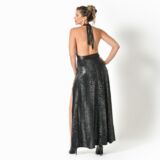 uiterst sexy en speels uitdagende vrouwelijk lange feest jurk in stevig, aangenaam en elastische zwart wetlook met een fantasie animal design, afgewerkt, gedecoreerd met enkele rainbow pailletten voor extra shine