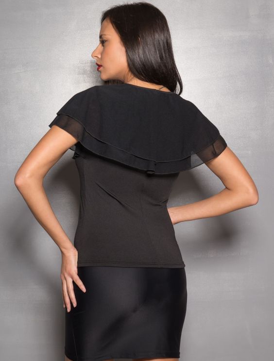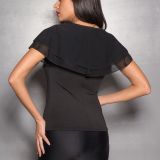 Zwarte design top met een sexy diep decolleté en losvallende voile powernet in 2 lagen