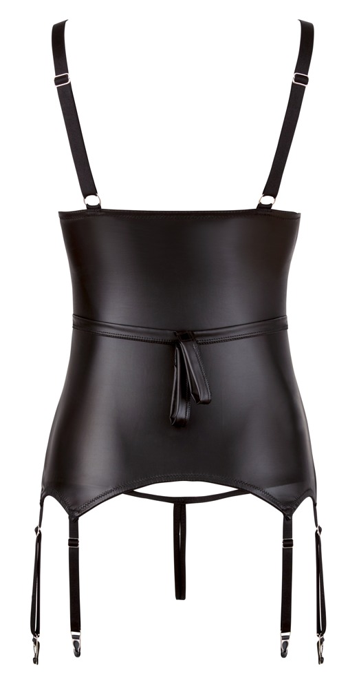 Zwarte corsage set met 6 verstelbare jarretellen en open kruis string in aangenaam glad en aansluitend wetlook