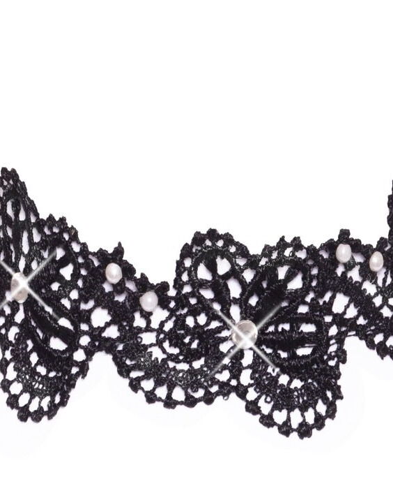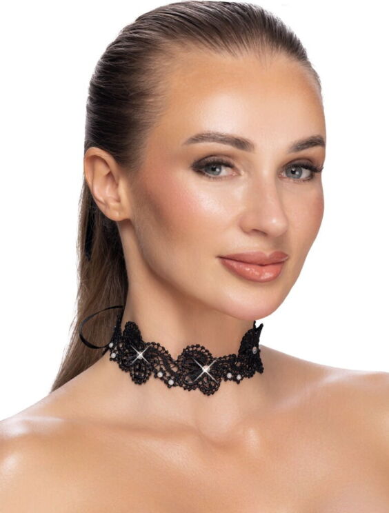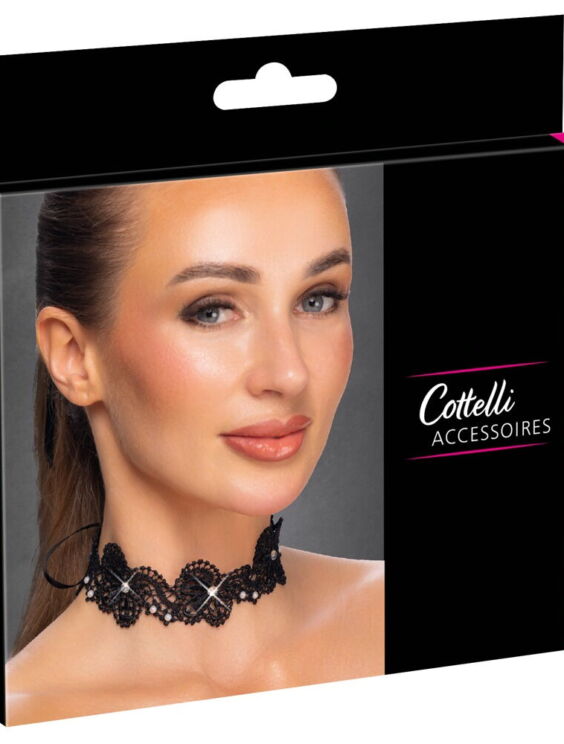 Zwarte halsketting van Cottelli ACCESSOIRES gemaakt van delicaat borduurwerk in kantlook. Versierd met parels en glinsterende strassteentjes. Zacht, behaaglijk 3 cm breed/hoog. Individueel verstelbaar satijnen bandje achter in de nek.