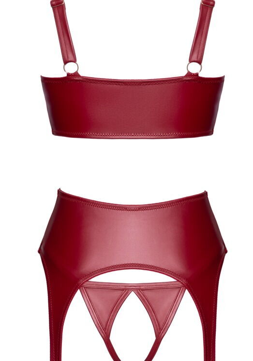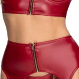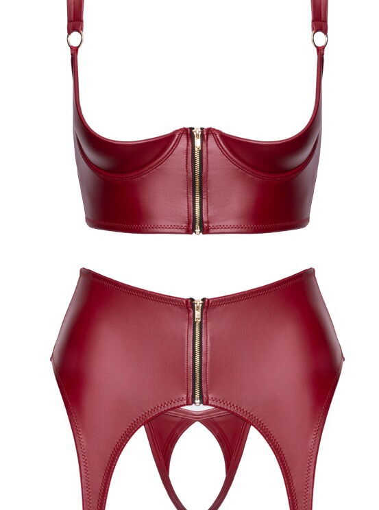 Opwindend open setje van Cottelli LINGERIE met een buste-uitsparende cup, kruisloze string en jarretelgordel met dijbanden. Elegante bordeauxrode matte look verleidelijk geaccentueerd met goudkleurige ringen en ritsen. Overal zacht en elastisch voor een hoog draagcomfort. Zowel de jarretelgordel als de jarretel hebben een doorlopende sierrits aan de voorkant. De langer uitgesneden bustier heeft licht gevoerde beugelcups om de vorm van de borsten te benadrukken. De bandjes kunnen op maat worden versteld. De jarretelgordel verleidt met stevig bevestigde dijbeenbandjes die ook op maat versteld kunnen worden. De string is volledig open bij het kruis.