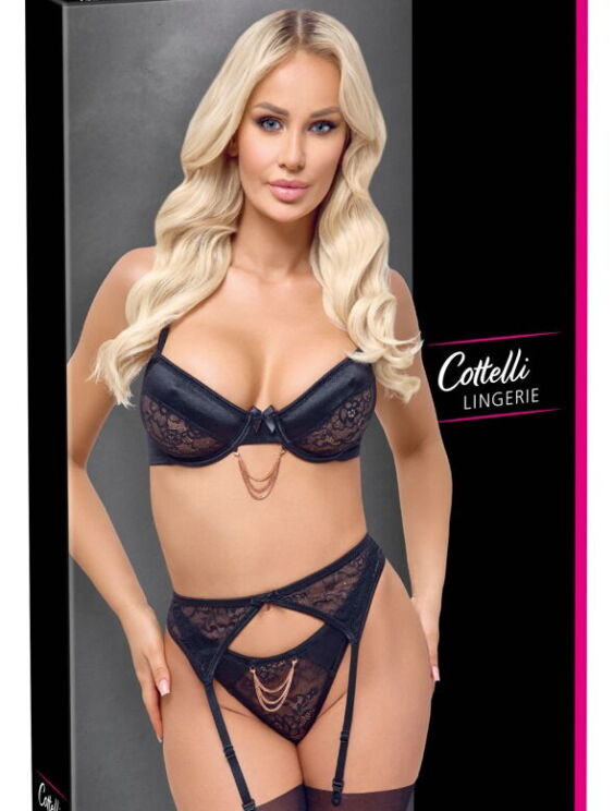 Beugelbeha, jarretelgordel en string gecombineerd in een zwart setje van Cottelli LINGERIE. Allemaal gemaakt van fijn, zacht stretchkant en elastisch satijn. De bh en string hebben een roségoudkleurige kettingrand aan de voorkant, die ook verwijderd kan worden. De bh-bandjes en de haaksluiting op de rug kunnen naar wens worden aangepast. Net als de haaksluiting aan de achterkant van de jarretelgordel en de jarretelbandjes.