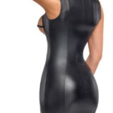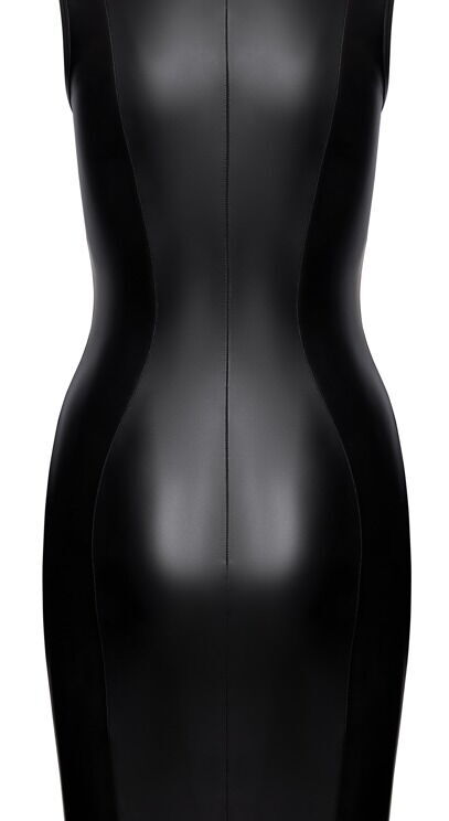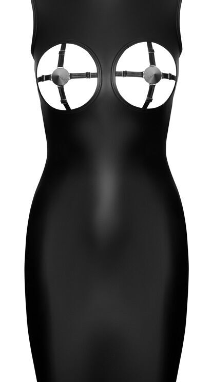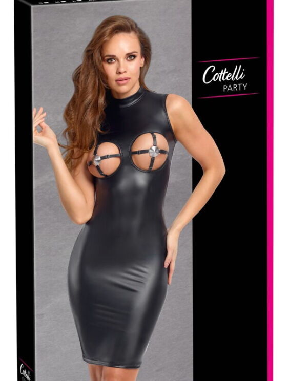 Mouwloze jurk van Cottelli PARTY in een geraffineerde zwarte matte look. In een nauwsluitend model met opstaande kraag en knielengte. De twee elastische openingen voor de afzonderlijke borsten zijn een echte blikvanger. Verstelbare borstbandjes met geïntegreerde, zilverkleurige tepelbedekkers geven de sexy look een spannende finishing touch. Met een lange ritssluiting aan de achterkant voor gemakkelijk aan- en uitkleden. Zacht en elastisch rondom voor een hoog draagcomfort.