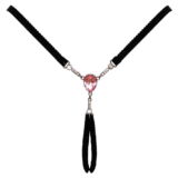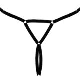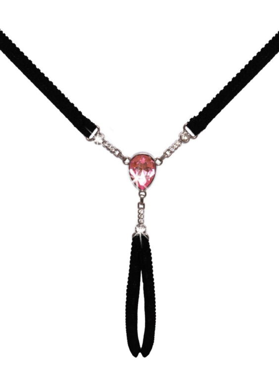 hij heeft zachte, zeer elastische bandjes en een open triangelvormige rug. De voorkant is versierd met een groot roze juweel en zilveren kettingen versierd met kleine glinsterende steentjes. Verstelbaar in de taille aan de zijkant. Verleidelijke opening in het kruis.