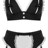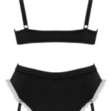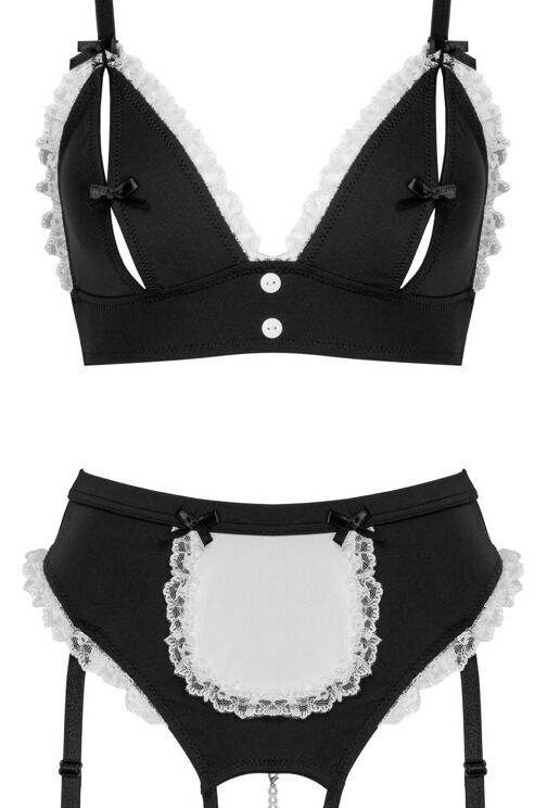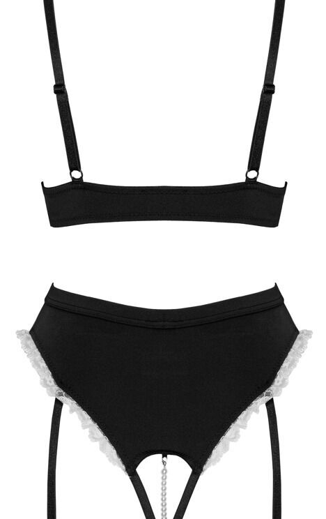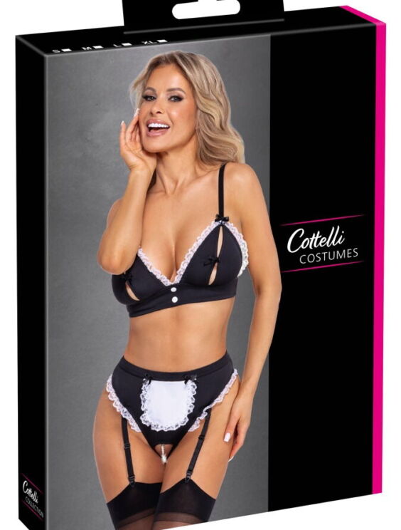 2-delige serveerset van Cottelli COSTUMES in een verleidelijke open look met bustier en jarretelkoord. Helemaal in zwart met speelse witte franje details en zwarte sierstrikjes. Bustier met kleine knoopjes tussen de opengesneden cups, elk bij elkaar gehouden door een klein decoratief strikje. De bandjes zijn verstelbaar. Jarretelkoord met een klein schortje aan de voorkant en stimulerende parelketting in het open kruis. De 4 jarretelbandjes zijn verstelbaar en volledig afneembaar.