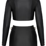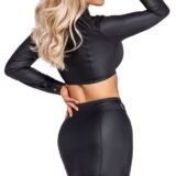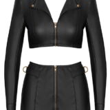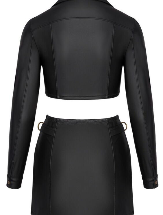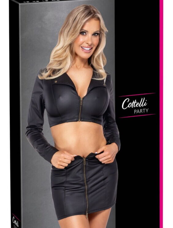 Clubwear set van Cottelli PARTY met een kort bovenstukje en minirok in een zwarte matte look met koperkleurige details. Overal zacht en elastisch voor een hoog draagcomfort. Buikvrije, nauwsluitende jasjestop met een korte doorlopende ritssluiting aan de voorkant. Decoratieve studs op de reverskraag en drukknopen op de manchetten. De slanke minirok heeft een doorlopende 2-weg ritssluiting aan de voorkant en ringen aan de zijkant van de elastische tailleband.