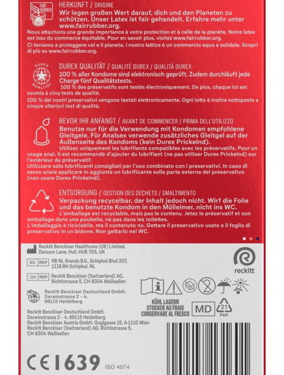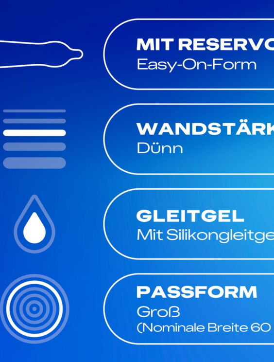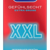 Transparante, dunne condooms Sensual Extra Large XXL van Durex met een grote pasvorm (nominale breedte 60 mm). Bevochtigd met siliconen glijmiddel. Vergeleken met conventionele cilindrische condooms biedt de innovatieve anatomische Easy-on vorm iets meer ruimte op de juiste plekken - voor makkelijker aanbrengen en afrollen, maar ook voor een comfortabele pasvorm en pure sensatie.