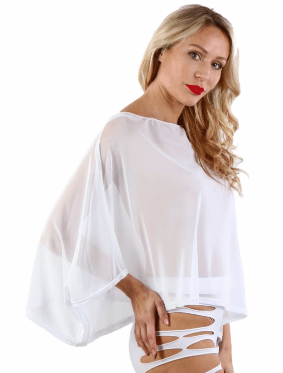 Ultra vrouwelijke en sexy uitdagende top in helderwit stevig, aangenaam en elastisch transparant powernet/gaasstof