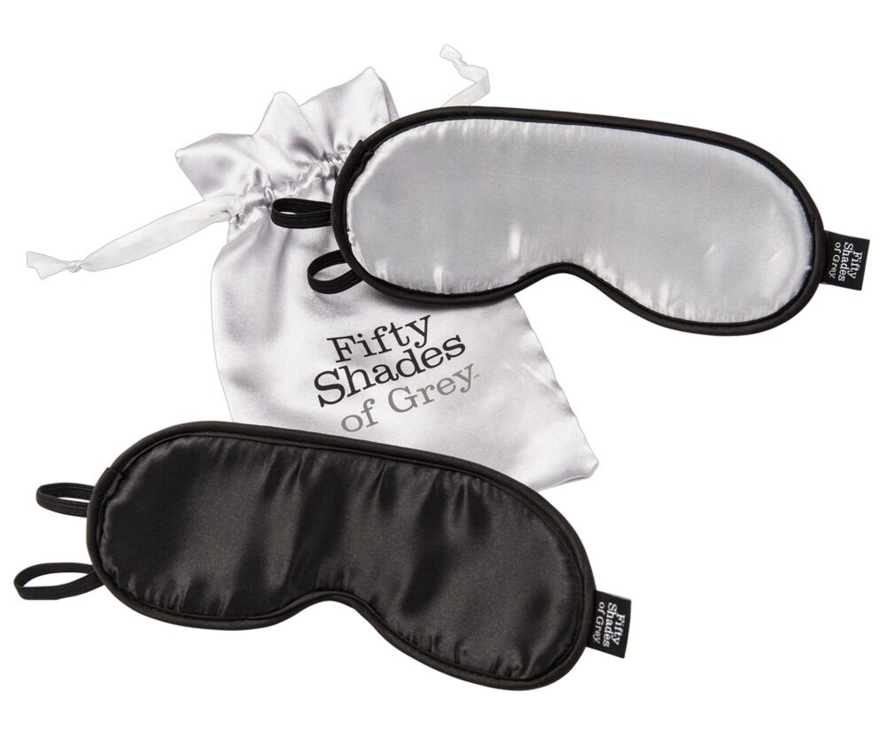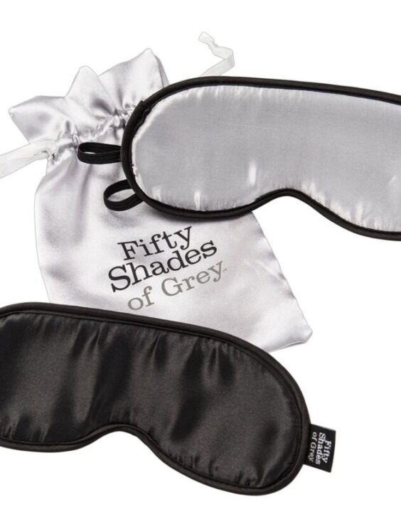 2 ondoorzichtige luxe oogmaskers in de No Peeking set van Vijftig Tinten Grijs, een in zilver en een in zwart. Ideaal voor zachte bondagespelletjes en als slaapmasker. Satijn aan de buitenkant, zacht imitatiebont aan de binnenkant. Elk 19 cm lang. Met rubberen hoofdbanden. Opbergtas inbegrepen.