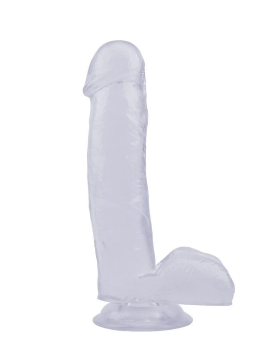Zeer realistisch aanvoelende kristalheldere penis dildo met testikels op een sterke zuigvoet