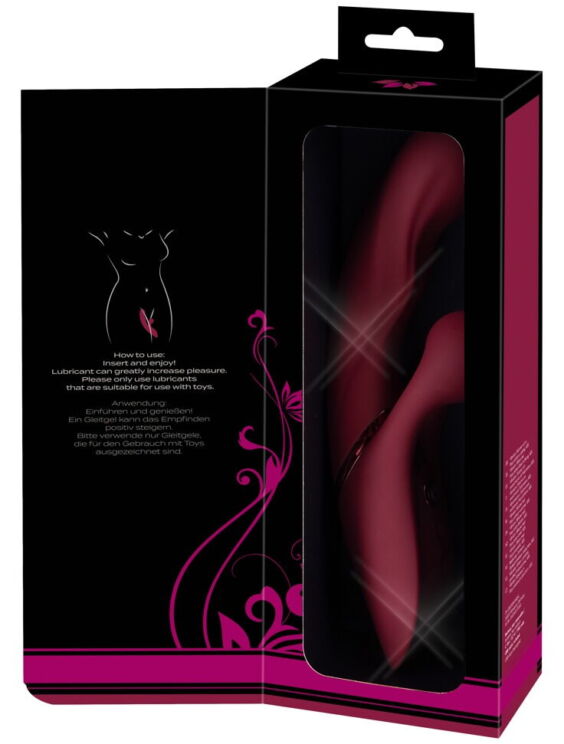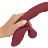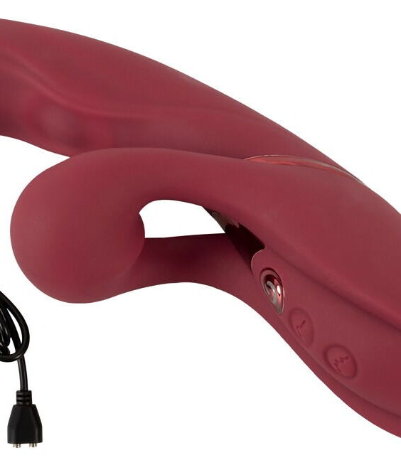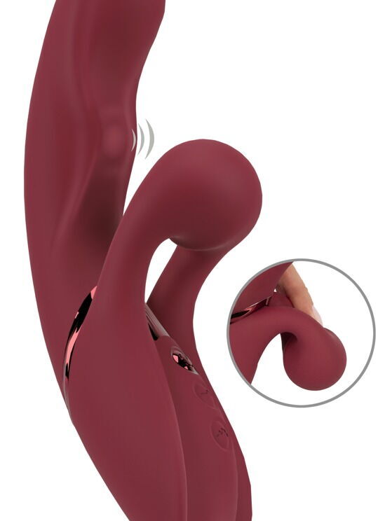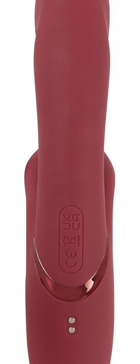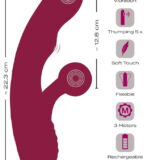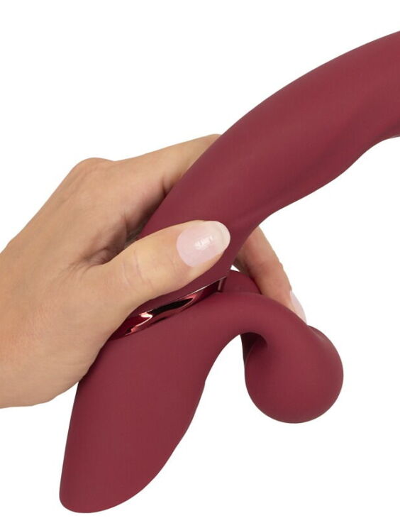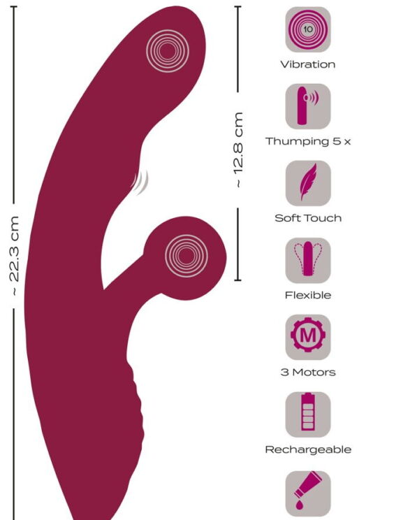 3 stille, krachtige motoren leveren betrouwbare kracht voor dubbele stimulatie. De gecombineerde vibraties in de gebogen top en in de flexibele clitorisbal kunnen worden geselecteerd in 10 standen. De kloppende klopfunctie (thumping) in de gebogen schacht biedt ook veel variatie met 5 standen. Beide functies kunnen gemakkelijk afzonderlijk worden bediend met de knoppen op het speeltje.