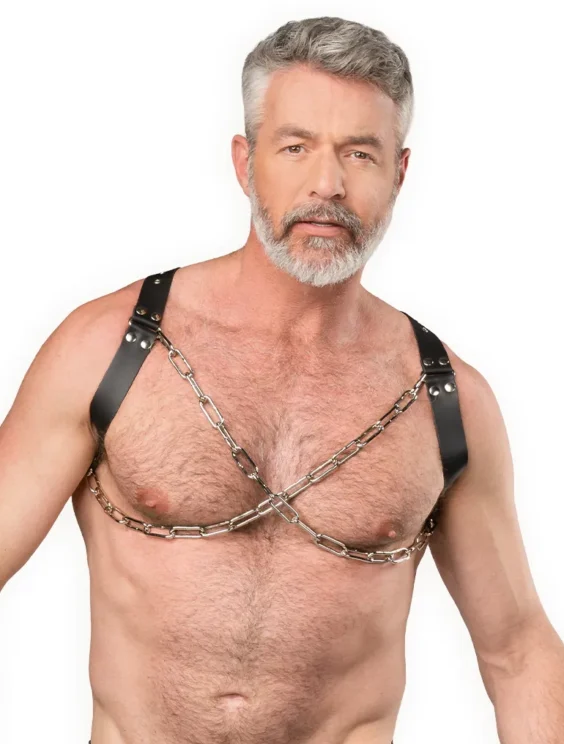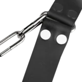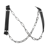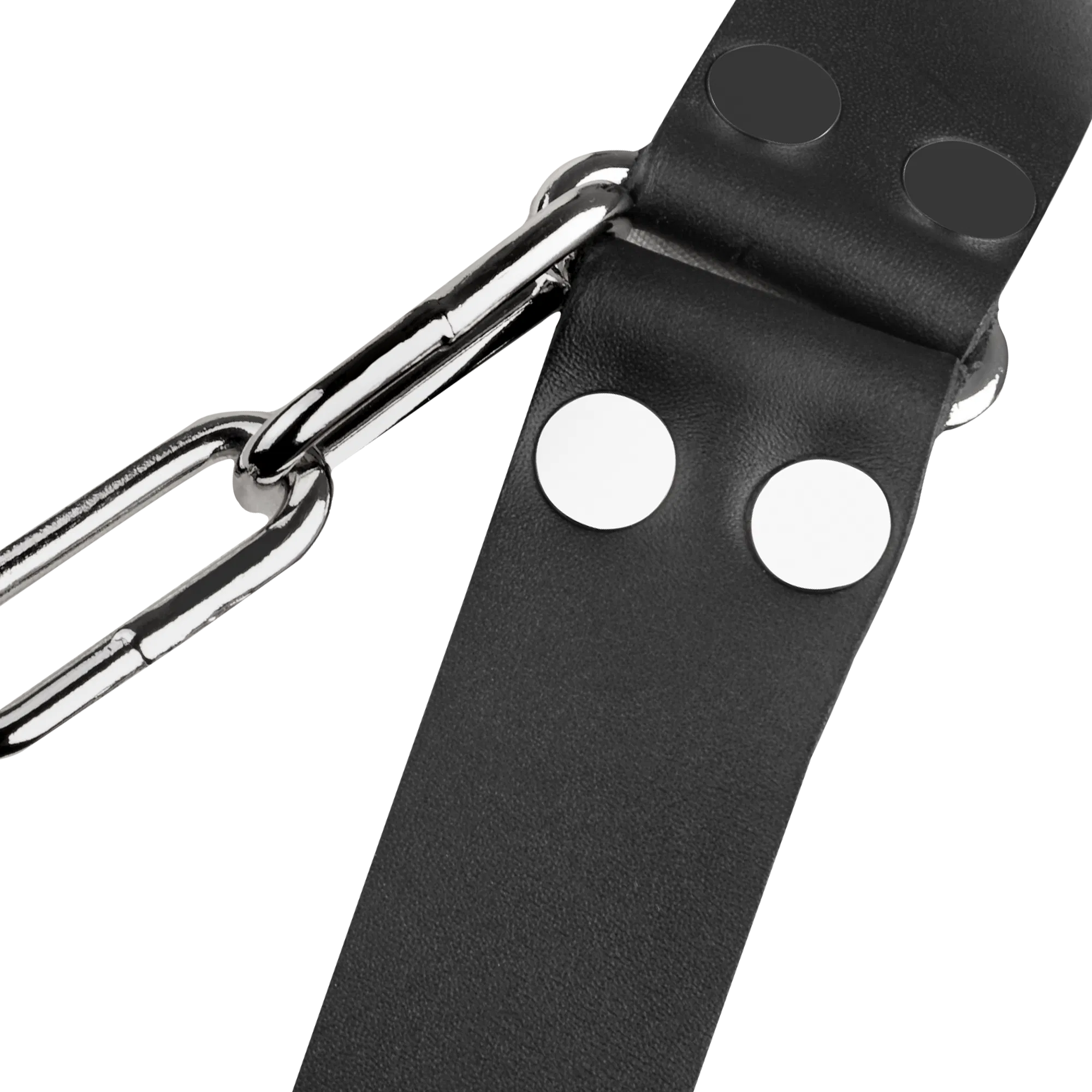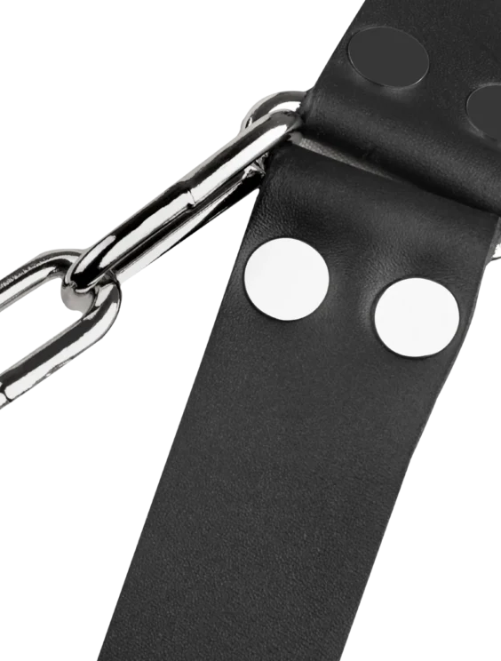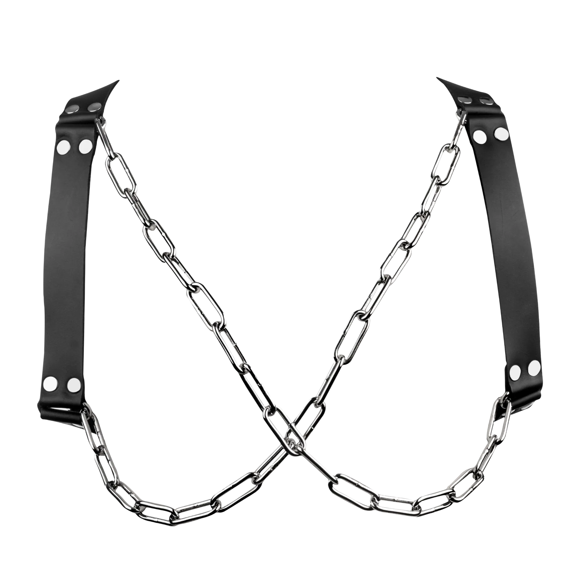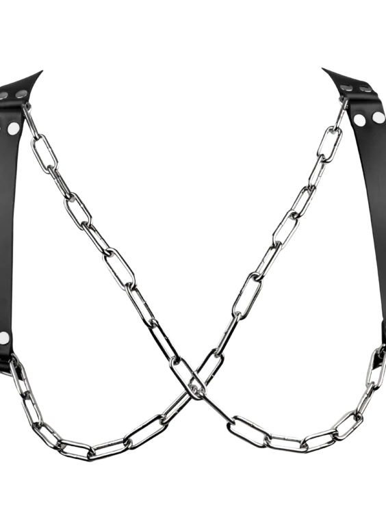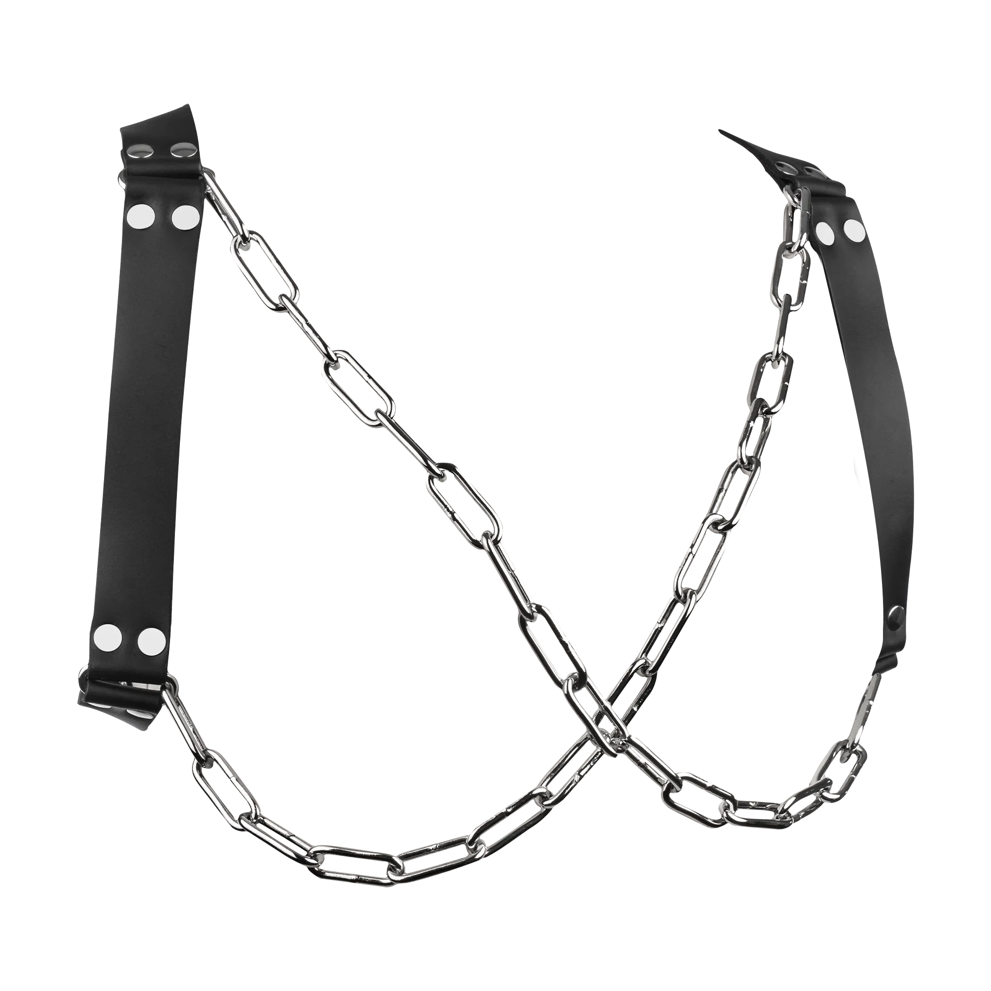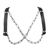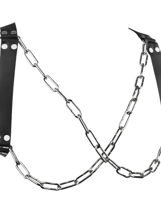 Dit speciale harnas is handgemaakt van echt zwart tuigleder en is versierd met grote metalen kettingen aan de voorkant.