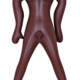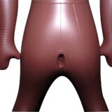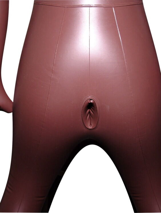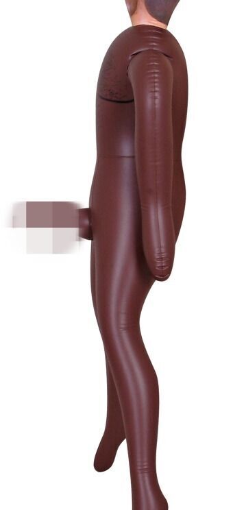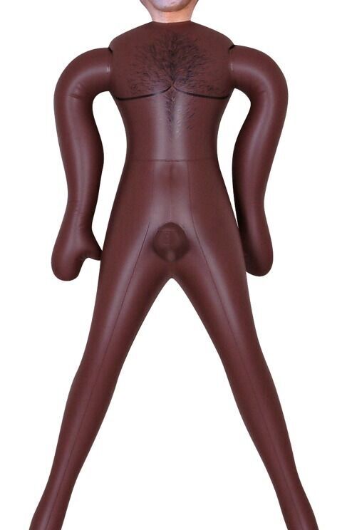 Mannelijke liefdespop met stevige penis, nauwe anale opening, ingeprent gezicht, donker haar en ingeprent borsthaar. Ongeveer 160 cm hoog wanneer opgeblazen. Materiaal: PVC.