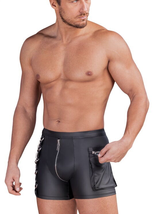 Strakke, accentuerende broek van NEK in een coole zwarte matte look met zilverkleurige details. Zacht, stretchy en met een bedekte elastische tailleband voor maximaal comfort. Met een onderliggende ritssluiting in de buidel. Met ringen en 3 afneembare karabijnkettingen aan de ene kant en een opgestikte cargozak met rits aan de andere kant.