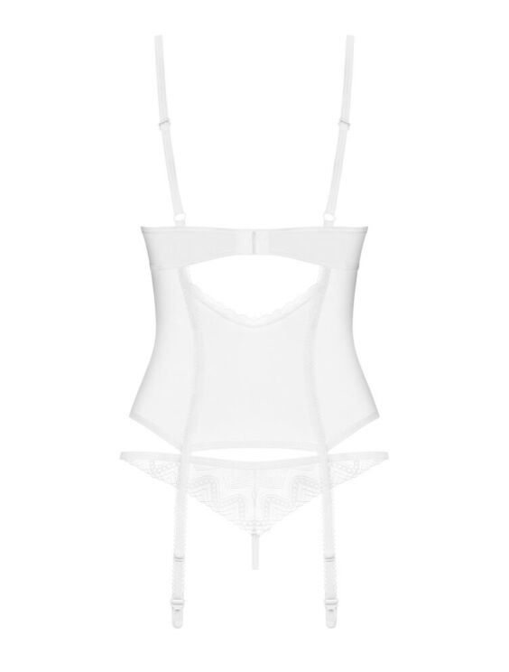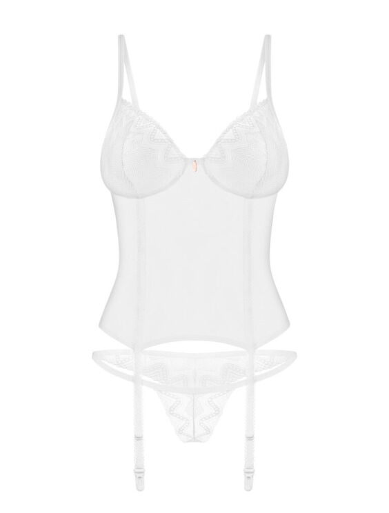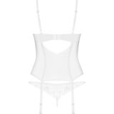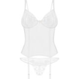 De transparante Alissium lingerieset van Obsessive bestaat uit een topje en een string. Hij is gemaakt van tule met kant met een patroon. De set heeft een elegante kleur: mooi en tijdloos wit. Hij is zacht en rekbaar voor een zeer comfortabele pasvorm. Tussen de beugelloze kanten cups zit een discreet decoratief detail. De bh-bandjes en haaksluiting aan de achterkant zijn verstelbaar. Ook de jarretelbandjes zijn verstelbaar. De kleine kanten string maakt deze sensuele en verleidelijke look helemaal af.