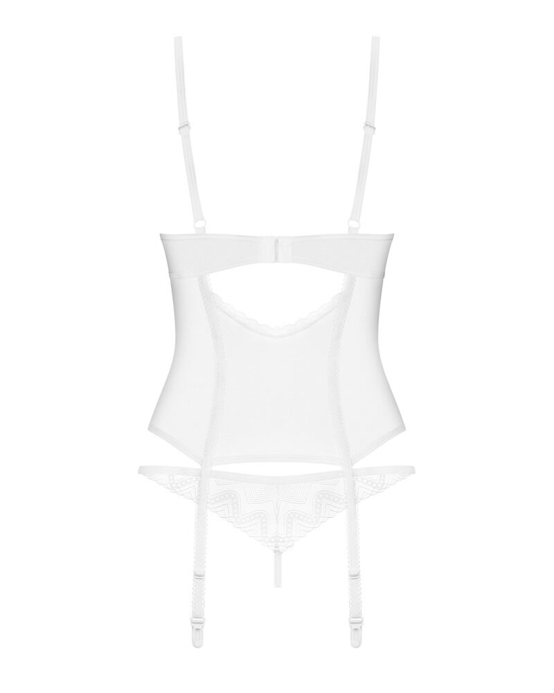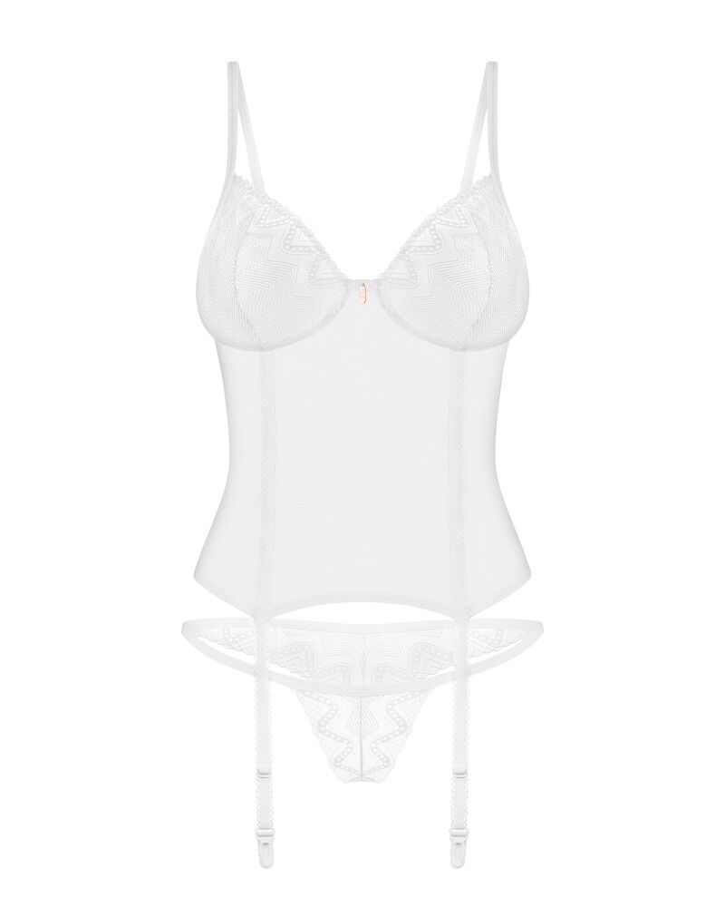De transparante Alissium lingerieset van Obsessive bestaat uit een topje en een string. Hij is gemaakt van tule met kant met een patroon. De set heeft een elegante kleur: mooi en tijdloos wit. Hij is zacht en rekbaar voor een zeer comfortabele pasvorm. Tussen de beugelloze kanten cups zit een discreet decoratief detail. De bh-bandjes en haaksluiting aan de achterkant zijn verstelbaar. Ook de jarretelbandjes zijn verstelbaar. De kleine kanten string maakt deze sensuele en verleidelijke look helemaal af.