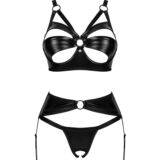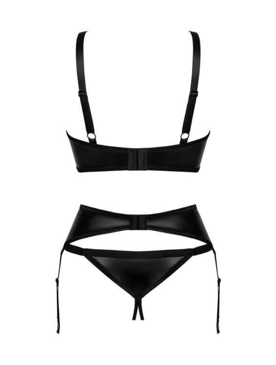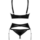 3-delige set Armares van Obsessive met beugelbeha, jarretelgordel en kruisloze string. Geheel in een trendy wetlook die elastisch is en zacht aanvoelt. Cups met verleidelijke uitsnijdingen en klein juwelenelement. De bandjes zijn slim vormgegeven met ringen en kunnen op maat worden versteld - net als de haaksluiting achter. De jarretelgordel heeft een ring aan de voorkant en een verstelbare haaksluiting aan de achterkant. De jarretelbandjes zijn ook verstelbaar. De wetlook string is verleidelijk open bij het kruis