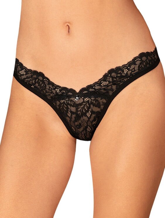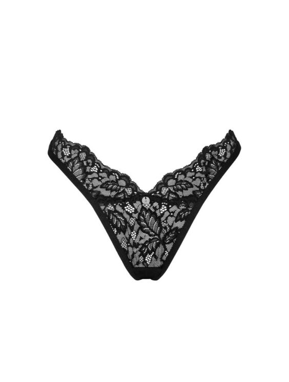 Zwarte string Bellastia van Obsessive, gemaakt van zacht, rekbaar bloemenkant. Met een klein sieraadelementje aan de voorkant van de tailleband.