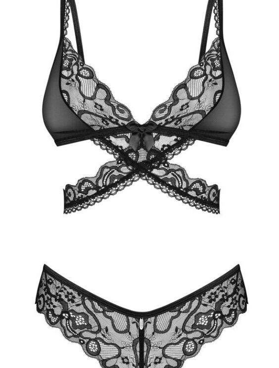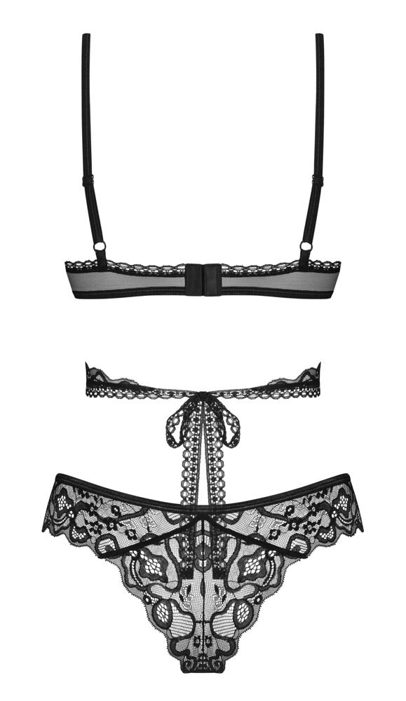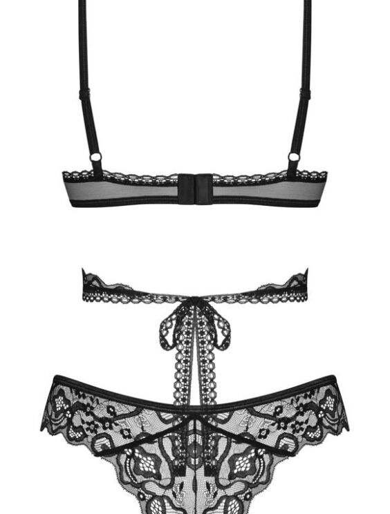 De tweedelige, transparante rugset Blomentis van Obsessive bestaat uit een bh en een slip. Hij is gemaakt van een delicate materiaalmix. De materialen zijn prachtig kant en delicate, elastische tule. De set is zacht en rekbaar voor een zeer comfortabele pasvorm. De bh heeft een klein strikje tussen de cups zonder beugel en er lopen ook kanten stroken over de borsten. De bandjes zijn verstelbaar. Aan de voorkant van de kanten slip zit een klein decoratief detail.