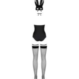 Bunny kostuum set van Obsessive in zwart. Bestaande uit een lichaam, vinyl hoofdmasker met oren, kraag en een paar clip jarretels en visnet kousen. Elastisch zacht lichaam in strapless kokermodel. Half hoofdmasker met oogopeningen, bandjes aan de achterkant. Satijnen kraag om vast te knopen. De afneembare clip jarretelbandjes zijn afgewerkt met dijbanden en strikjes.