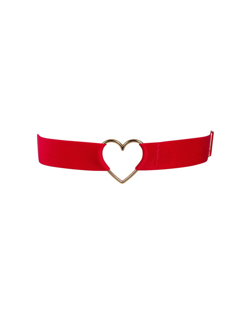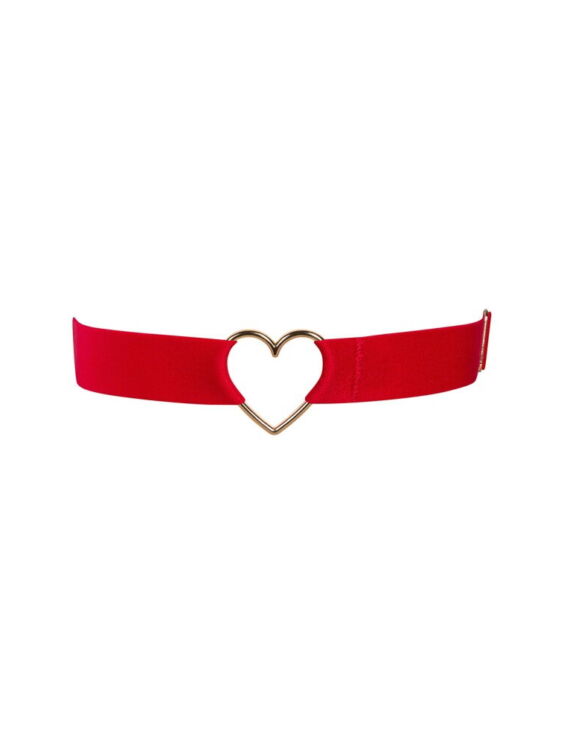 Rode elastische kousenband Elianes van Obsessive met een goudkleurig decoratief hartje als schakel. Zacht en soepel voor een hoog draagcomfort. Verstelbaar voor een antislip pasvorm.