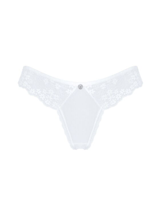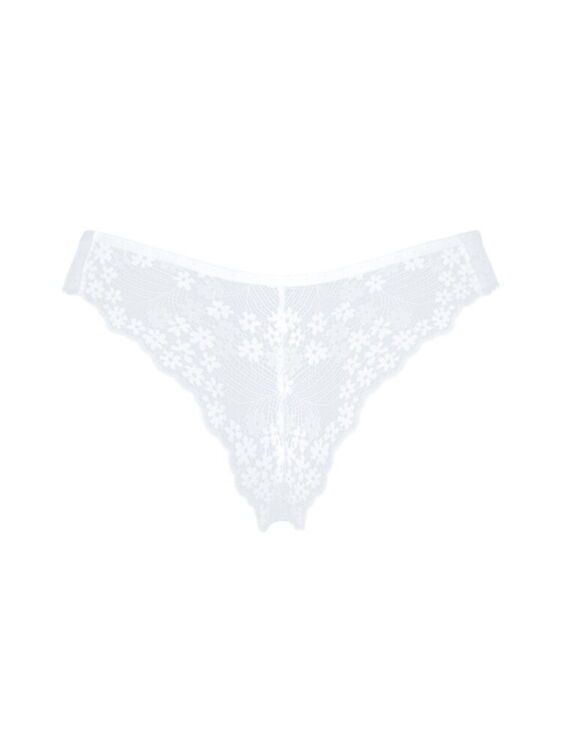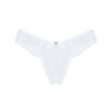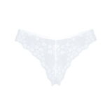 Witte Heavenlly string van Obsessive gemaakt van fijne stretch tule. Verleidelijk ton sur ton opgevoerd met prachtig bloemenkant. In een Braziliaanse V-snit met een klein juwelenelement aan de voorkant van de tailleband.