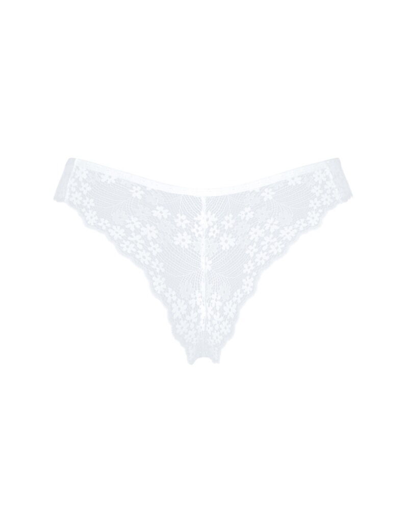 Witte Heavenlly string van Obsessive gemaakt van fijne stretch tule. Verleidelijk ton sur ton opgevoerd met prachtig bloemenkant. In een Braziliaanse V-snit met een klein juwelenelement aan de voorkant van de tailleband.