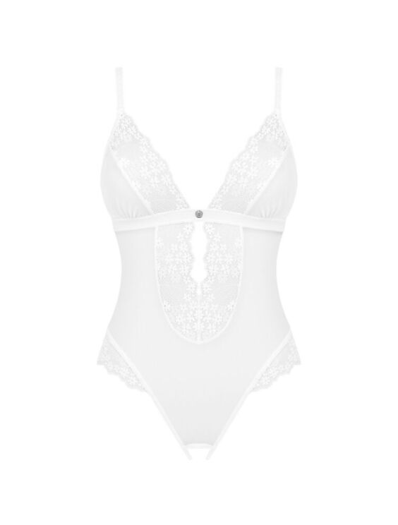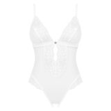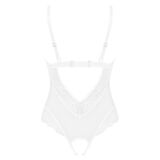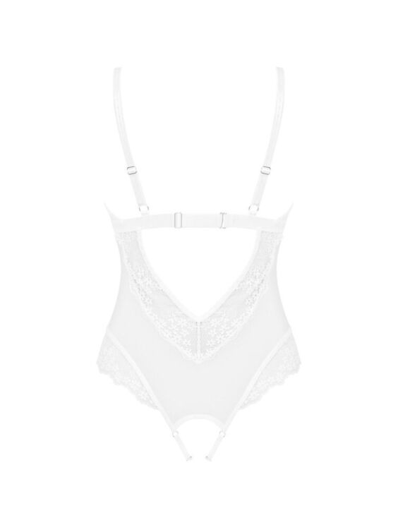 Transparante witte ouvert Heavenlly body van Obsessive met prachtige kanten details. Overal zacht en elastisch voor een hoog draagcomfort. De bandjes en touwtjes in het open kruis zijn verstelbaar. Net als de stretchband in de open rug met haaksluiting.