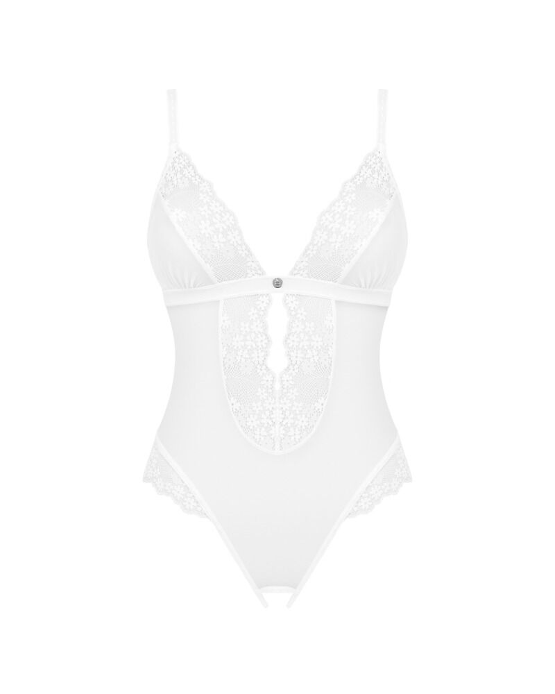 Transparante witte ouvert Heavenlly body van Obsessive met prachtige kanten details. Overal zacht en elastisch voor een hoog draagcomfort. De bandjes en touwtjes in het open kruis zijn verstelbaar. Net als de stretchband in de open rug met haaksluiting.