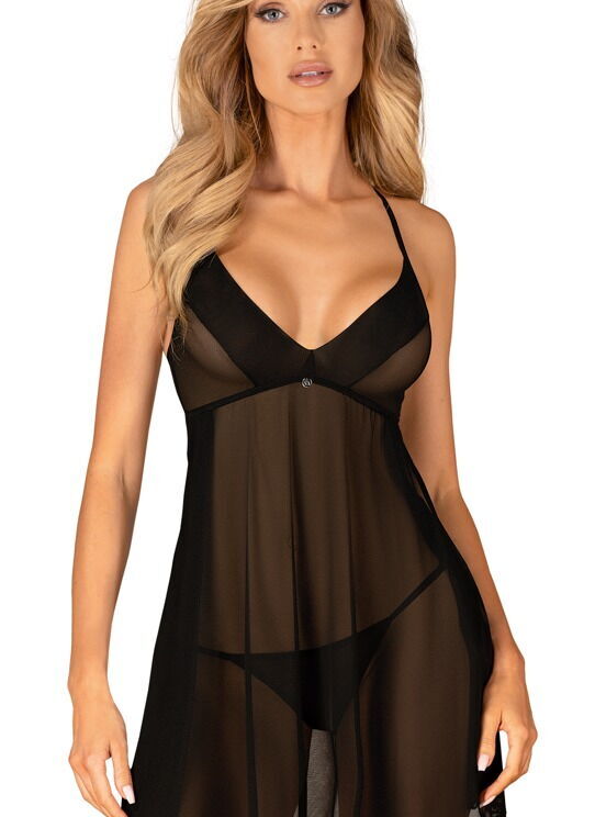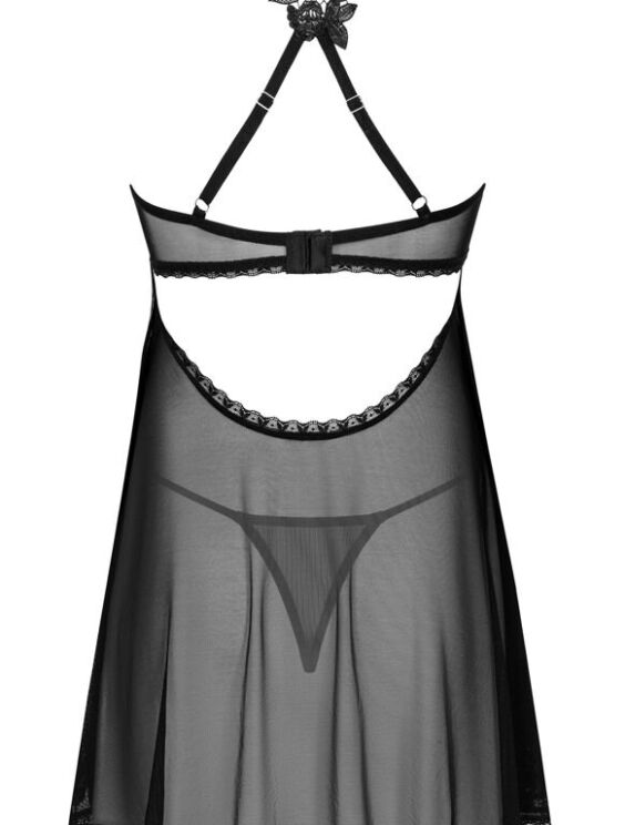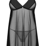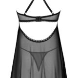Babydoll en string in de zwart-transparante set Latinesa van Obsessive. Luchtig, zacht en rekbaar voor een hoog draagcomfort. Korte, uitlopende babydoll met een sieraadelement in de diepe halslijn. De verstelbare bandjes kruisen elkaar op de rug en zijn versierd met gedetailleerd borduurwerk. De haaksluiting in de lage ruguitsparing is verstelbaar.