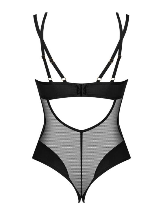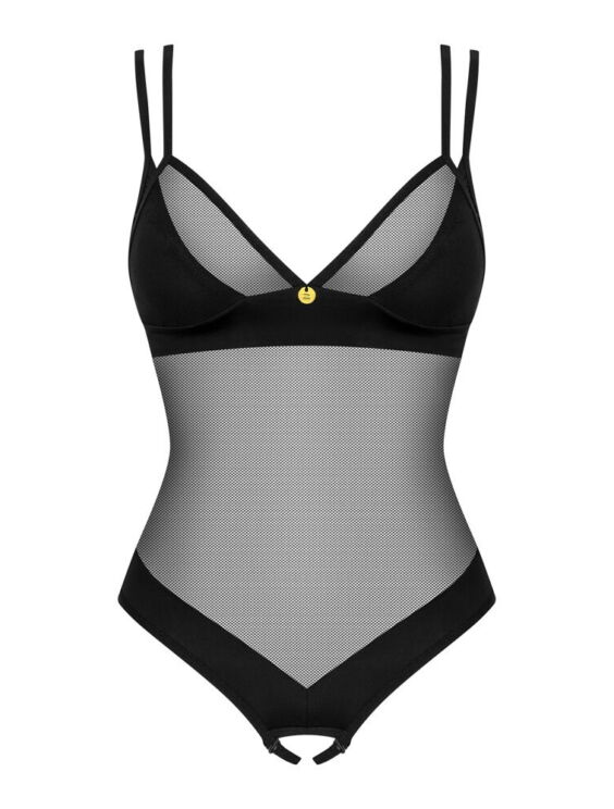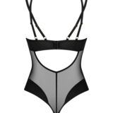 Zwarte body zonder kruis Nesari van Obsessive. Fijne elastische mesh met ondoorzichtige details. Zacht en rekbaar rondom voor een hoog draagcomfort. Bh met een decoratief element tussen de cups en een verstelbare haaksluiting in de lage ruguitsparing. De slim gekruiste dubbele bandjes zijn ook verstelbaar. Het kruis met twee koordjes is verleidelijk zichtbaar.