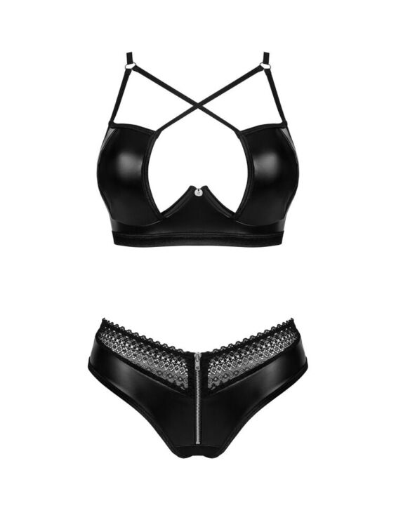 Tweedelige zwarte set van Norides van Obsessive met een beugelbeha en een slipje in een wetlook die rekbaar en zacht aanvoelt. Beugelbeha in een verfijnde stijl met bandjes en een extravagante halslijn. De bandjes zijn verstelbaar, net als de haaksluiting aan de achterkant. Het slipje verleidt met kanten inzetstukken in de tailleband en een rits aan de voorkant.
