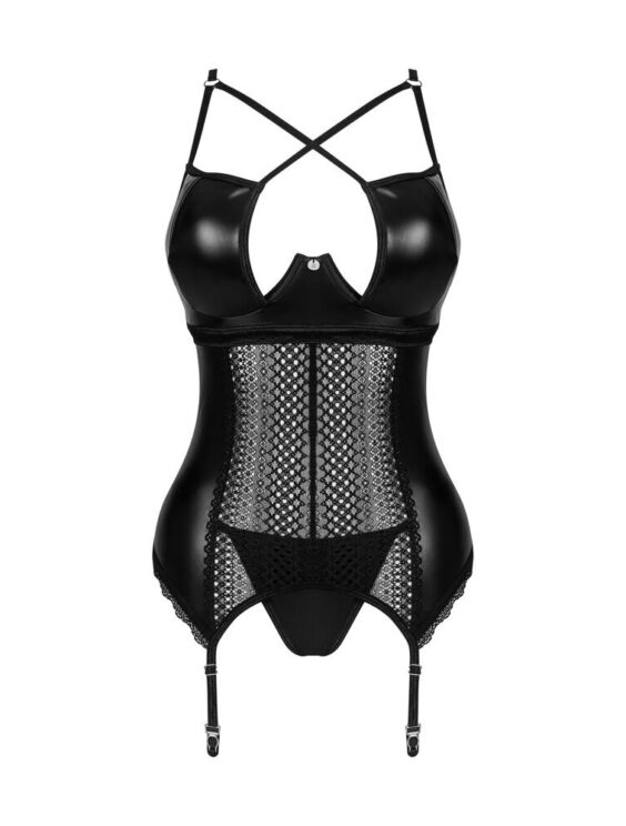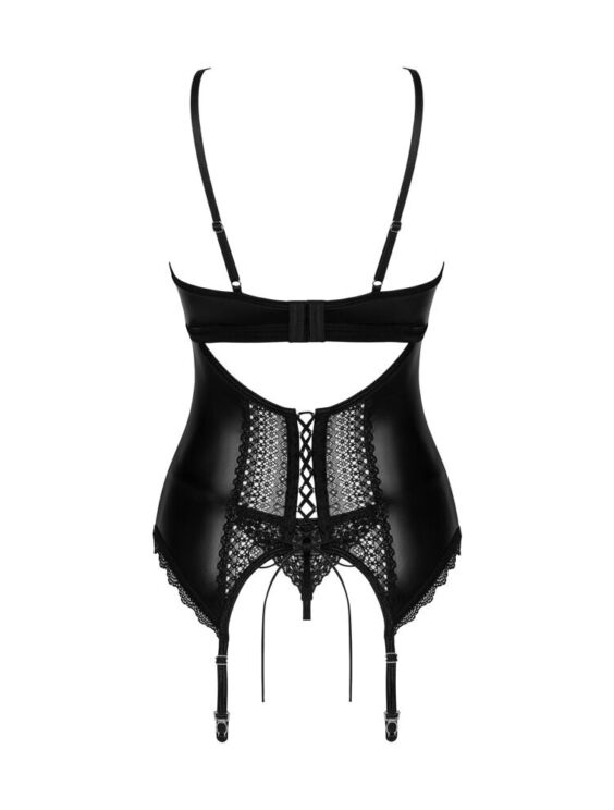 Jarretelcorsage en string in de zwarte Norides set van Obsessive. In een elegante wetlook die rekbaar en zacht aanvoelt. Met prachtige kanten inzetstukken en details. Beugelcups in een verfijnde stijl met bandjes en een extravagante halslijn. Met vetersluiting aan de achterkant die verstelbaar is. Net als de bandjes en de haaksluiting in de lage rug. Ook de jarretelbandjes zijn verstelbaar. De wetlook string verleidt met een klein kanten driehoekje op de billen.