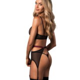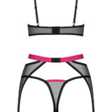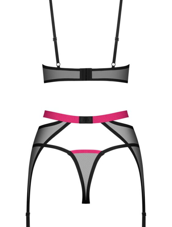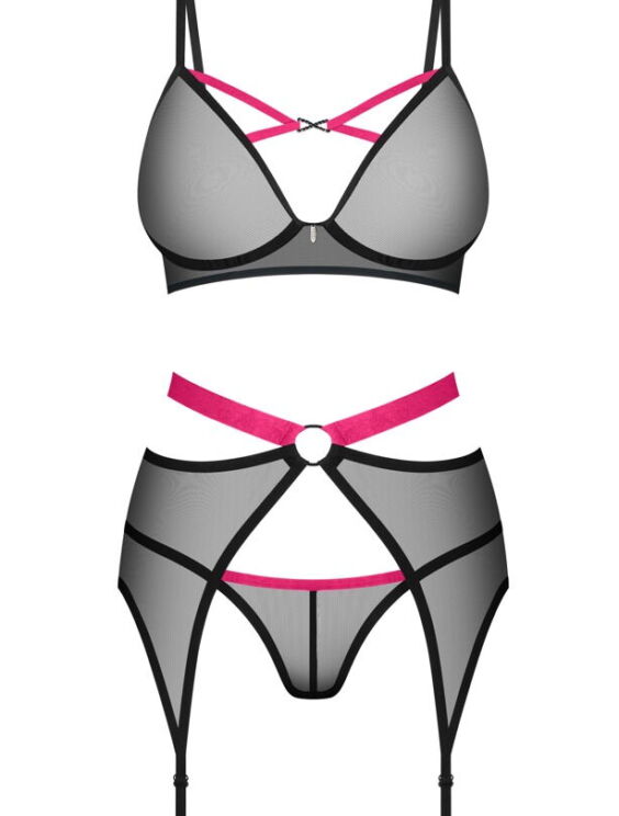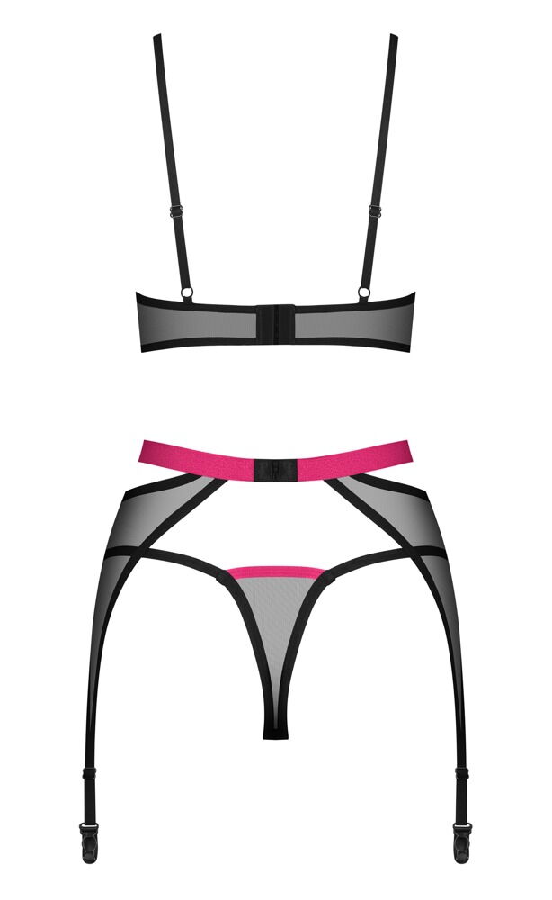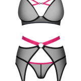 3-Delige Novenes jarretelset van Obsessive met zachte beha, jarretelgordel en V-string. Gemaakt van fijn zwart powernet met roze-gekleurde accenten. Bh met decolletébandjes en een prachtig strass-element tussen de softcups. De bandjes zijn op maat verstelbaar. Net als de haakjessluiting op de rug. De mooie jarretelgordel verleidt met een contrastkleurige tailleband en ring aan de voorkant. Hij heeft een verstelbare haaksluiting aan de achterkant en de jarretelbandjes kunnen ook worden aangepast. De bijpassende V-string maakt dit elegante transparante trio compleet.