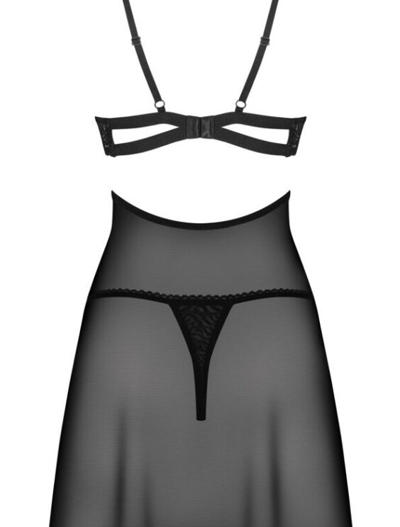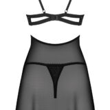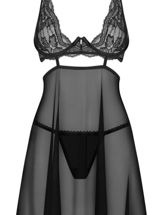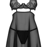 De zwarte lingerieset Nutris van Obsessive bestaat uit een babydoll en een string. De babydoll is gemaakt van spannend transparant materiaal en heeft kanten beugelcups. Het decoratieve element tussen de cups is een echte blikvanger. Er is ook een mooie uitsparing – het uitlopende rokgedeelte begint onder de uitsparing. Het rokgedeelte is gemaakt van zachte, rekbare tule. De haaksluiting aan de achterkant en de bandjes zijn verstelbaar.