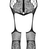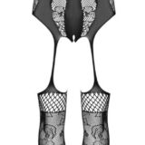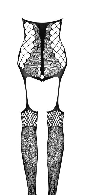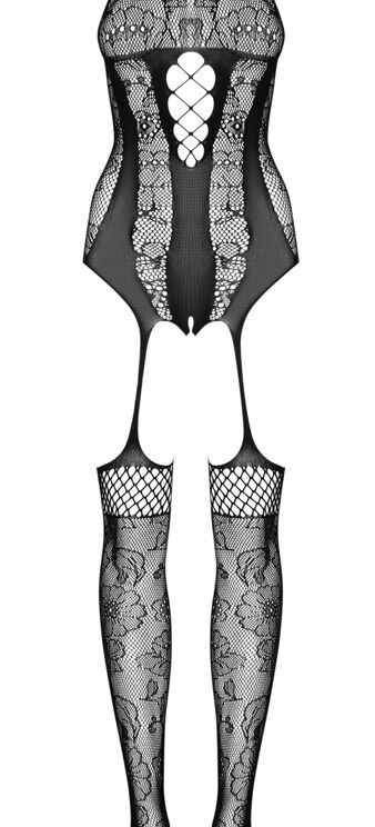 Zwarte catsuit kruisloos van Obsessive in verschillende mesh en tule transparanties met een ingeweven bloemenlook. In een verleidelijke jarretellook met een open kruis. Met halternek, rugloos. Met voet, versterkt teengedeelte. Overal zacht en elastisch voor hoog draagcomfort.