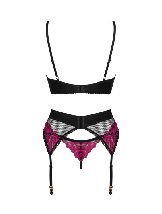 elegant 3-delig jarretelsetje Rosenty van Obsessive met beugelbeha, jarretelgordel en string. Zacht zwart mesh en fijn roze rozenkant in een stijlvolle mix met ondoorzichtig zwart stretchmateriaal. Beha met decoratief element tussen de beugelcups en verstelbare haaksluiting op de rug. De bandjes kunnen ook op maat worden versteld. Net als de jarretelbandjes en de haaksluiting op de jarretelgordel.