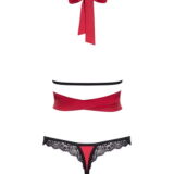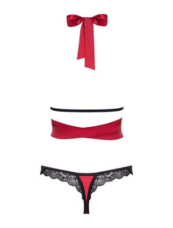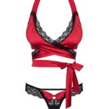 De Sensuelia lingerieset van Obsessive bestaat uit een top en een string. Gemaakt van zacht rood stretchsatijn en delicaat zwart kant. De wikkeltop wordt aan de voorkant en in de nek gestrikt. Een stretchbandje onder de buste zorgt voor extra ondersteuning. De string heeft een verleidelijke rode strik aan de open voorkant.