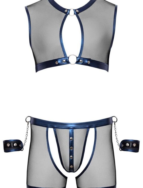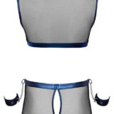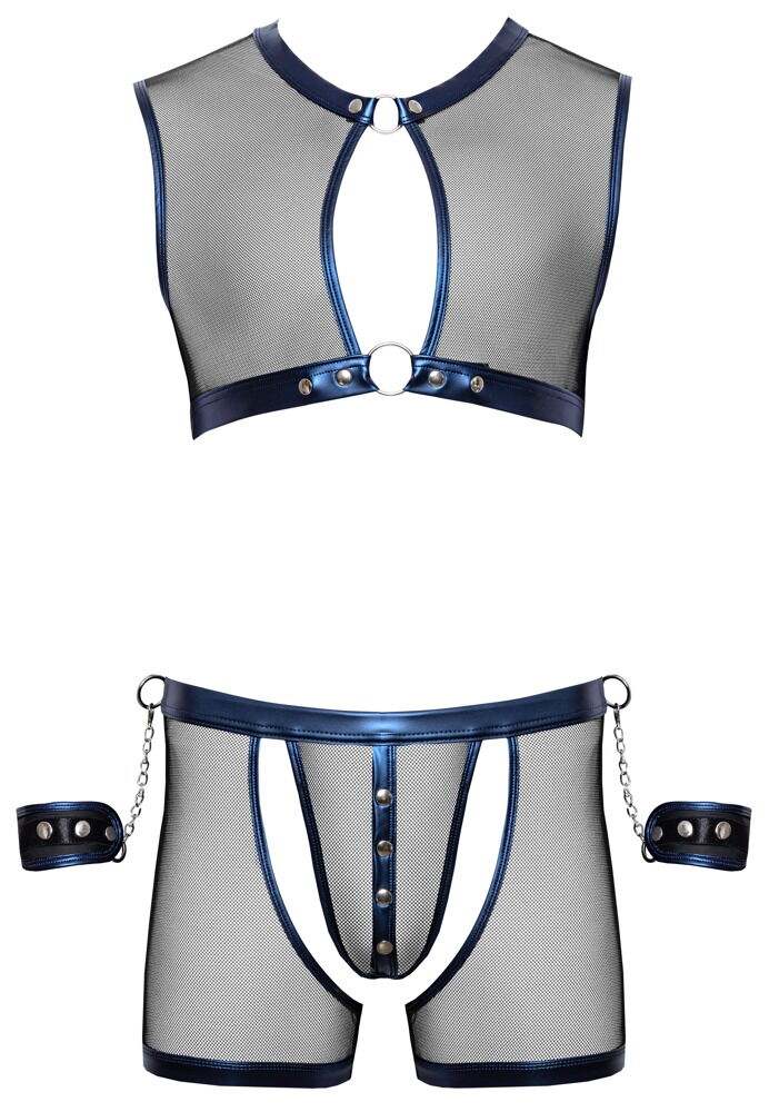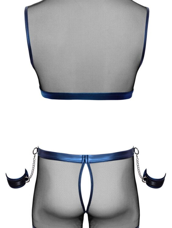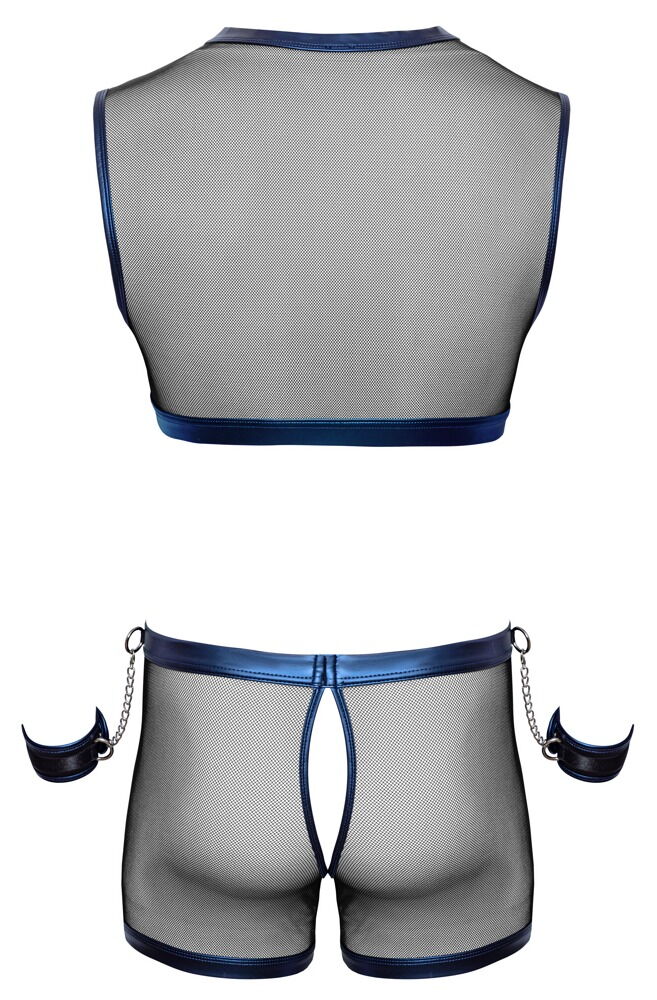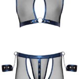 Strak aansluitend kort topje, accentuerende broek en 2 handboeien in een set van Svenjoyment Bondage. Zwart, transparant, rekbaar, zacht mesh omrand in een geraffineerde blauwe metallic wetlook. Opvallende accenten van zilverkleurige studs en ringen. Top en broek met onthullende uitsnijdingen aan de voorkant. De broek is ook open over de billen. De twee bijgevoegde handboeien kunnen snel aan de top en broek worden bevestigd met hun karabijnkettingen. De zachte manchetten in een blauwe metallic wetlook zijn gemakkelijk aan te trekken en te verstellen dankzij de klittenbandsluitingen.