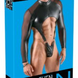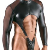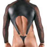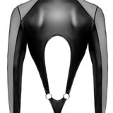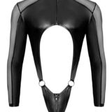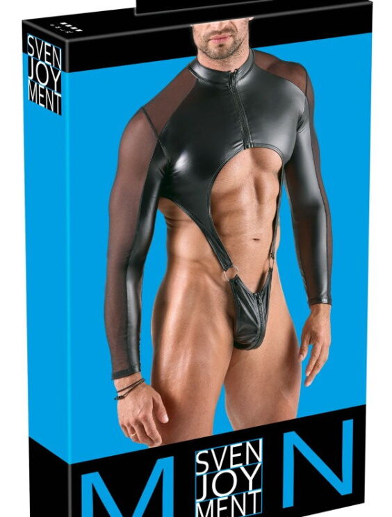 Zwarte, nauwsluitende riobody van Svenjoyment met lange mouwen. Provocerende stijl in een ondoorzichtige matte look met transparante powernet inzetstukken. Elastisch en zacht voor een hoog draagcomfort. Grote uitsnijding met ringen aan de voorkant. Opstaande kraag en ritssluiting bovenop, met een verborgen ritssluiting in het zakje eronder.