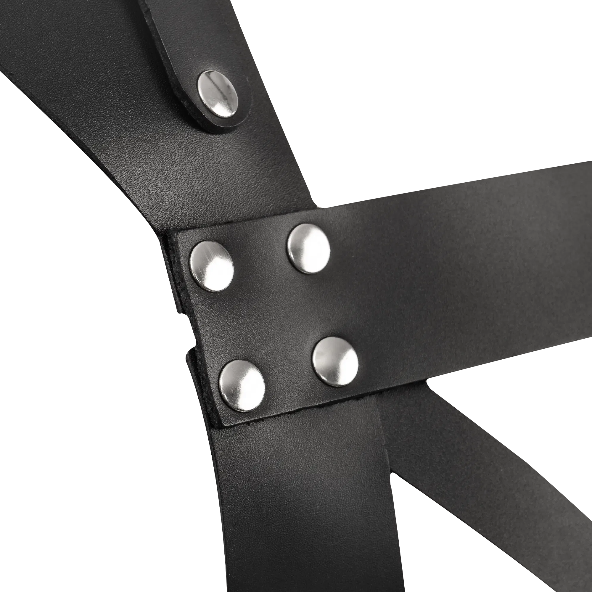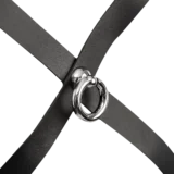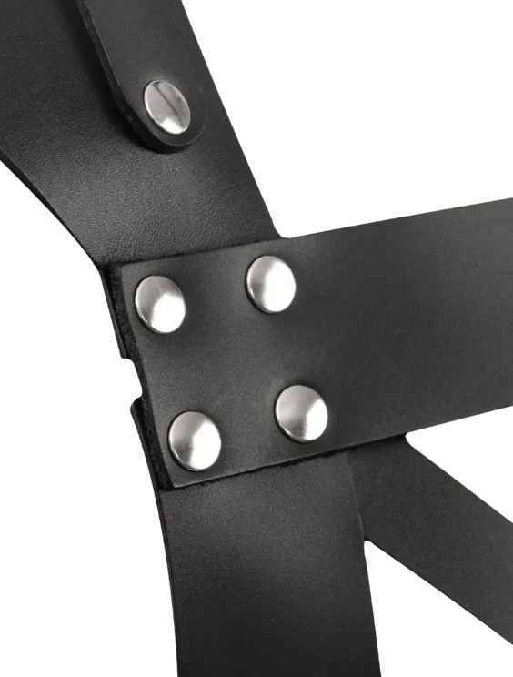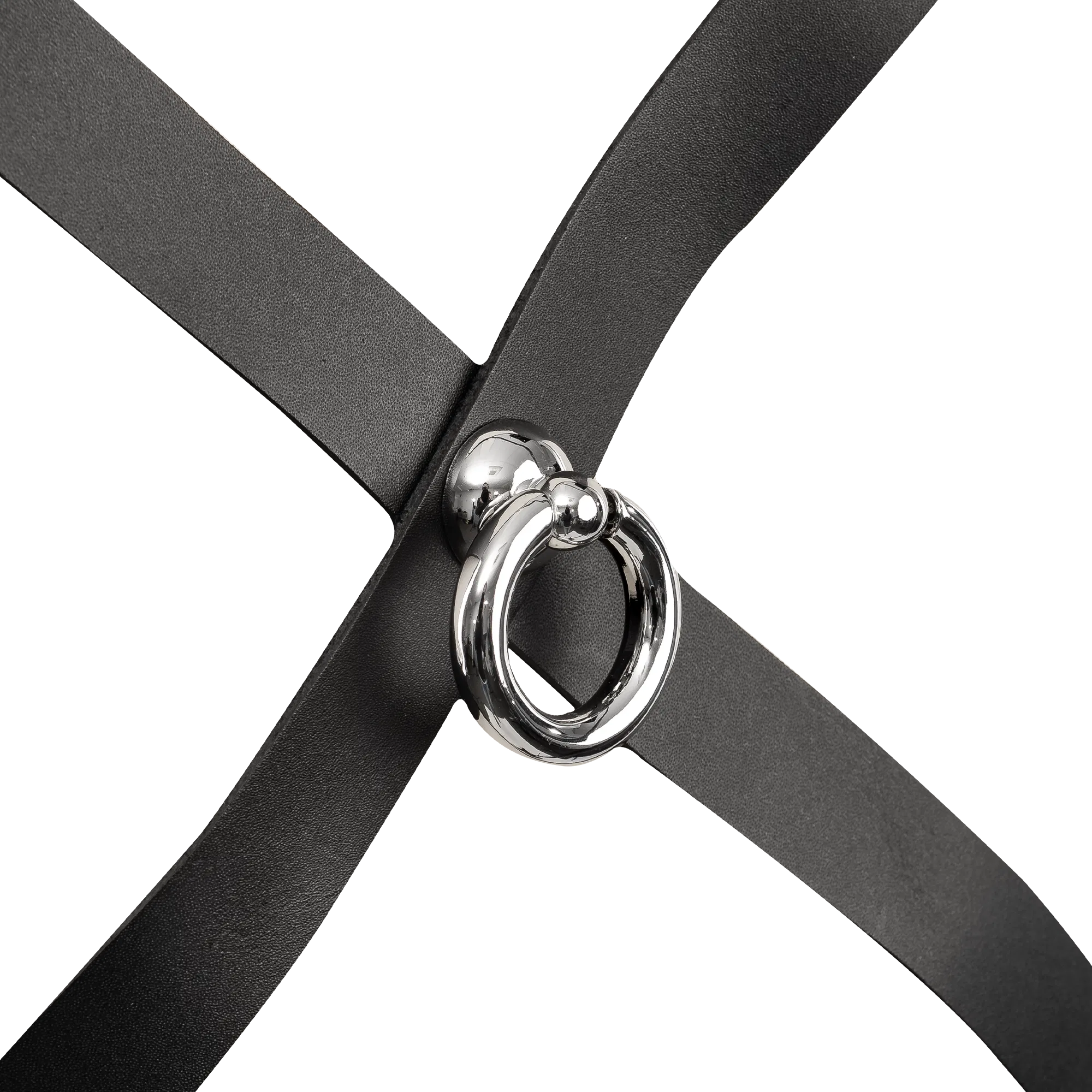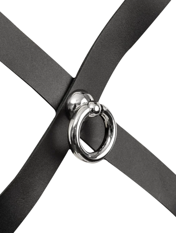 Het is afgewerkt met metalen studs en een O-ring aan de voorkant, voor eventuele bondage spelletjes met leash....