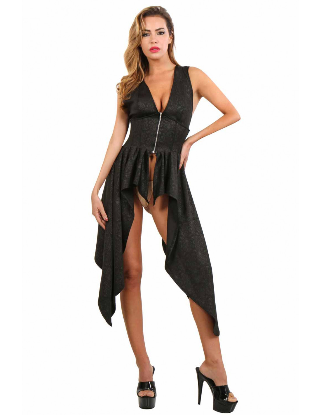 • Zwarte korset jurk in stevig elastisch dikke corrigerende stof met mooi brokaat boudoir design