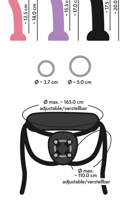 4-delige set uit de Your Strap-on Collection van You2Toys met harnas en 3 verschillende maten dildo's (S, M, L). Elke zuignap dildo wordt snel en eenvoudig in het in maat verstelbare strap-on harnas geschoven en vervangen. Natuurlijk ook solo gebruik mogelijk. Een gevarieerde set! Geschikt voor vaginaal en anaal gebruik!