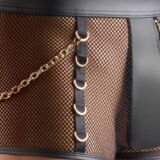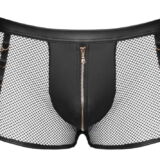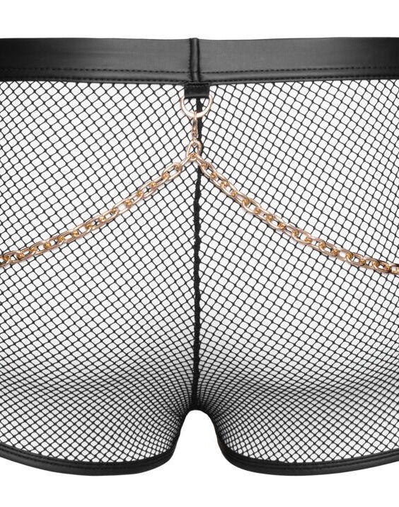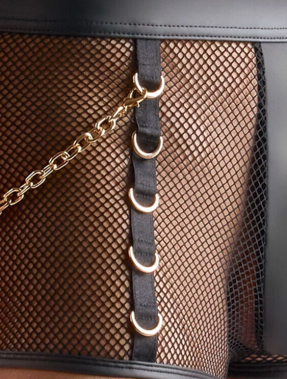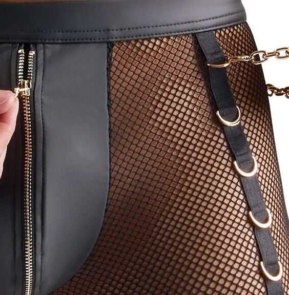 Opvallende zwarte broek van Svenjoyment gemaakt van onthullend netmateriaal gemixt met een trendy wetlook. Met ritssluiting in het ondoorzichtige zakje. Overal elastiek en zacht en soepel voor een hoog draagcomfort. Decoratieve goudkleurige ringen aan de voorkant, zijkant en achterkant van de tailleband. De twee goudkleurige karabijnkettingen zijn afneembaar.