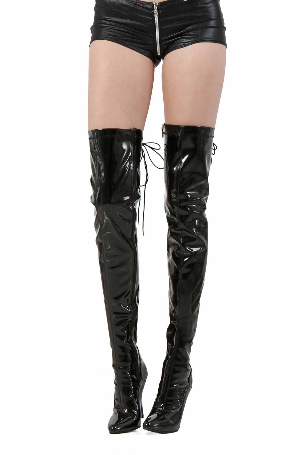 Sexy zwarte stiletto laarzen in vinyl/lak met rits aan de binnenzijde van het been en een regelbare veter op de achterkant